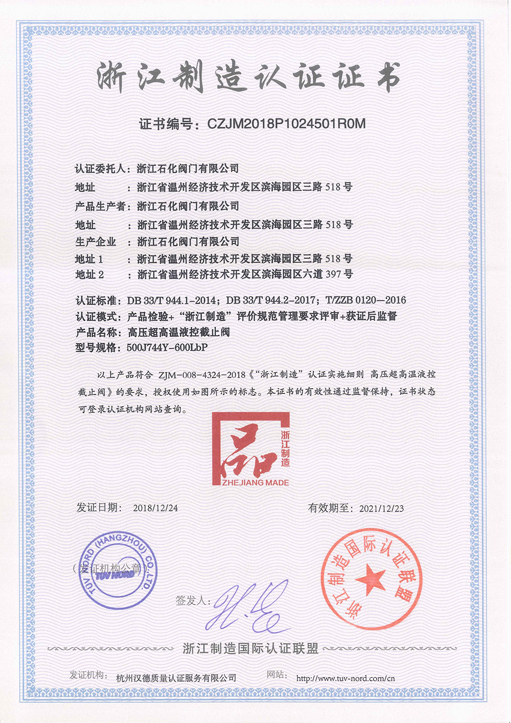 我公司于2018年12月通過了《高壓超高溫液控截止閥》的浙江制造認證證書,為了深入推進“三強一制造”建設,打響“品字標浙江制造”品牌,浙江制造推行了“品字標”企業“四個百分百”計劃,努力實現“品字標”企業廠區車間100%亮標、質量承諾100%公示、品牌產品100%貼標、廣告宣傳100%植入,以此不斷提升“品字標”品牌的社會知名度、認可度和美譽度。